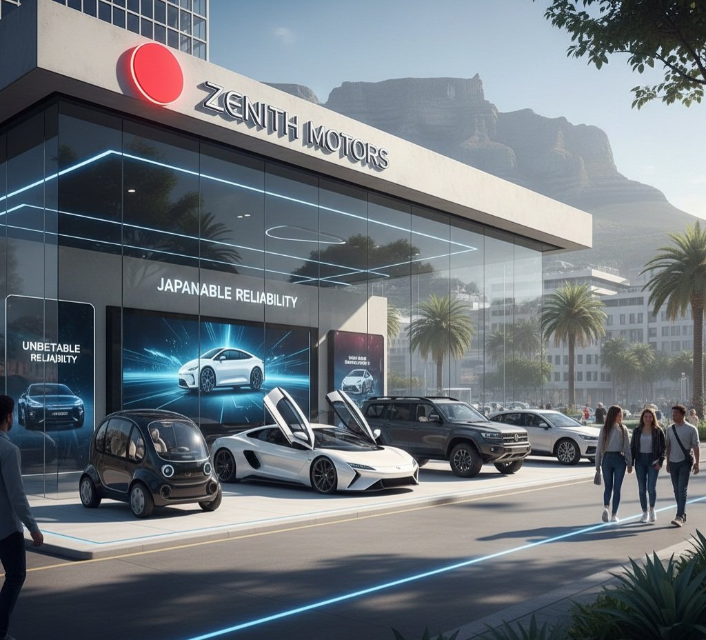 - An AI-generated image of a futuristic Japanese car showroom in a South African city.
